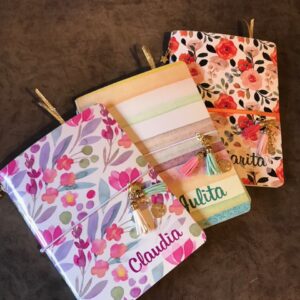 Anotador Midori de tapa blanda contiene en su interior 3 cuadernillos intercambiables que pueden ser reemplazados por otros, dos con hojas blancas lisas y uno con bolsillos de cartonaje para guardar notas, tickets , fotos y todo lo que desees. Totalmente artesanales, ningún diseño se repite.