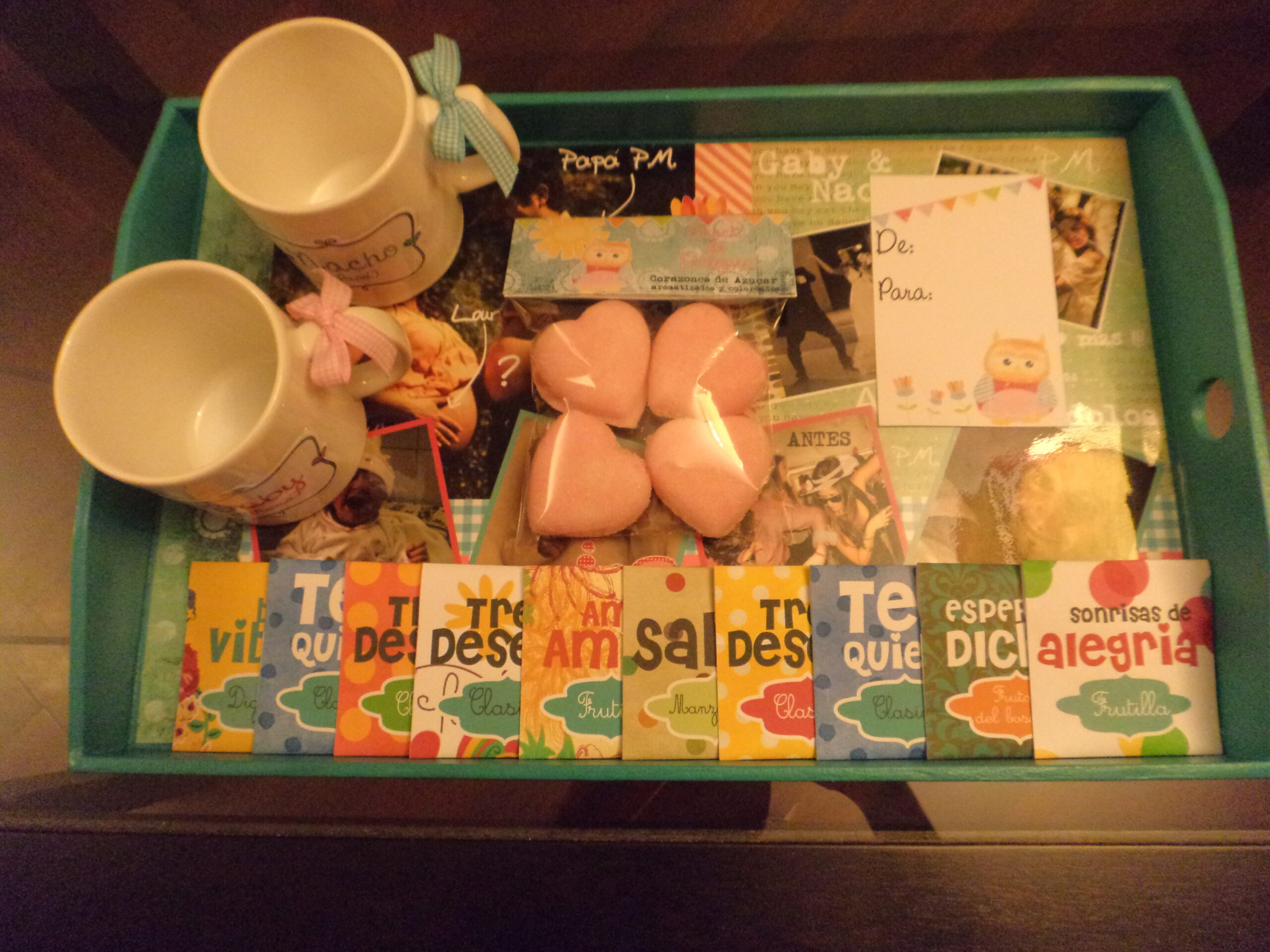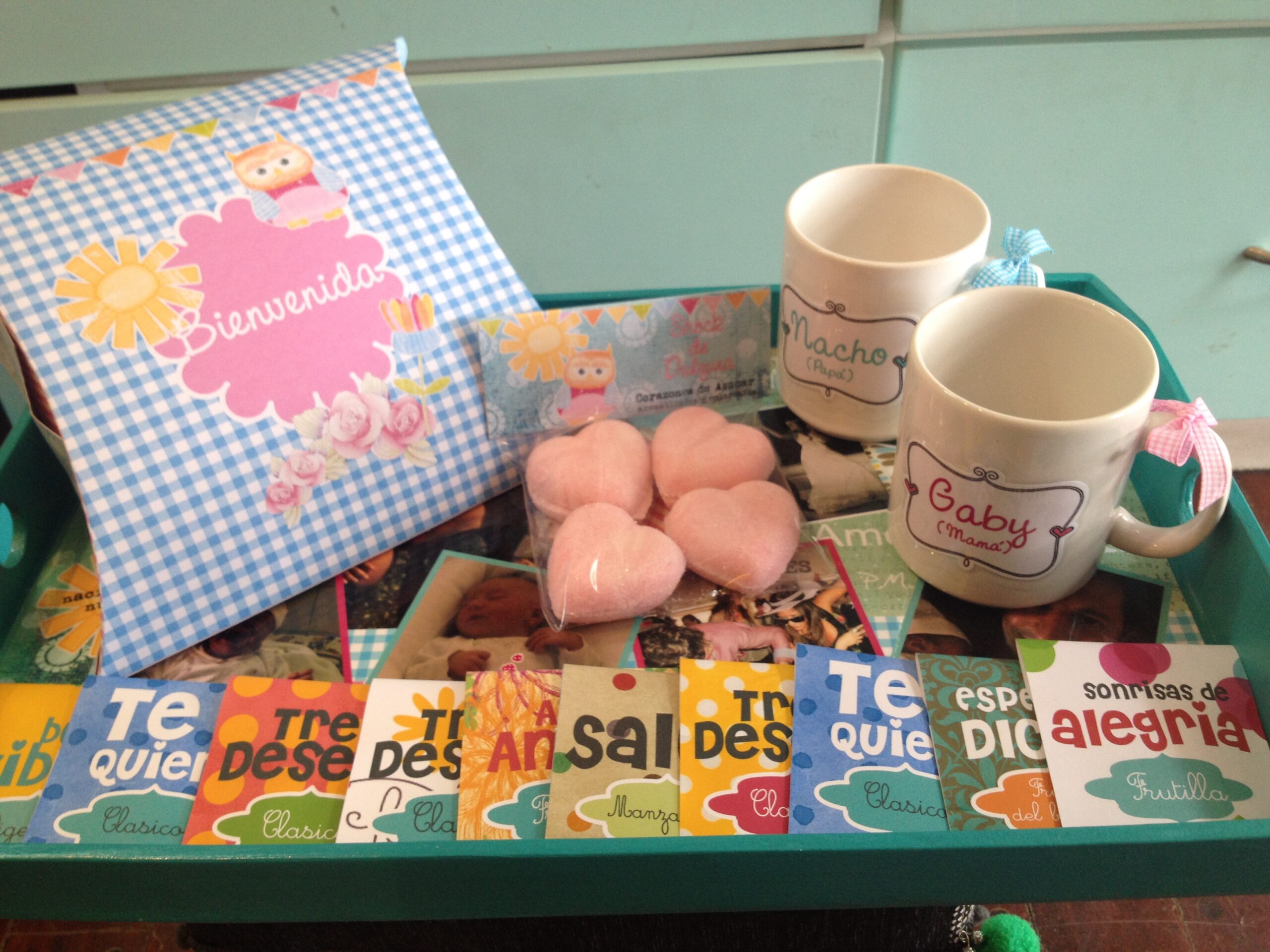 Incluimos sobres de infusiones con frases, azúcar aromática con formas, toppers para cupecakes , servilletero ,tarjetón acorde a la temática y envoltorios para golosinas.