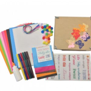 Prensa formada por tapa y contratapa de madera, 4 tornillos y 4 mariposas metálicas, cartones corrugados, cartulinas y hojas de distintos colores, adhesivo vinílico, marcadores, pompones, stickers, instructivo e ideas y mucho más!!