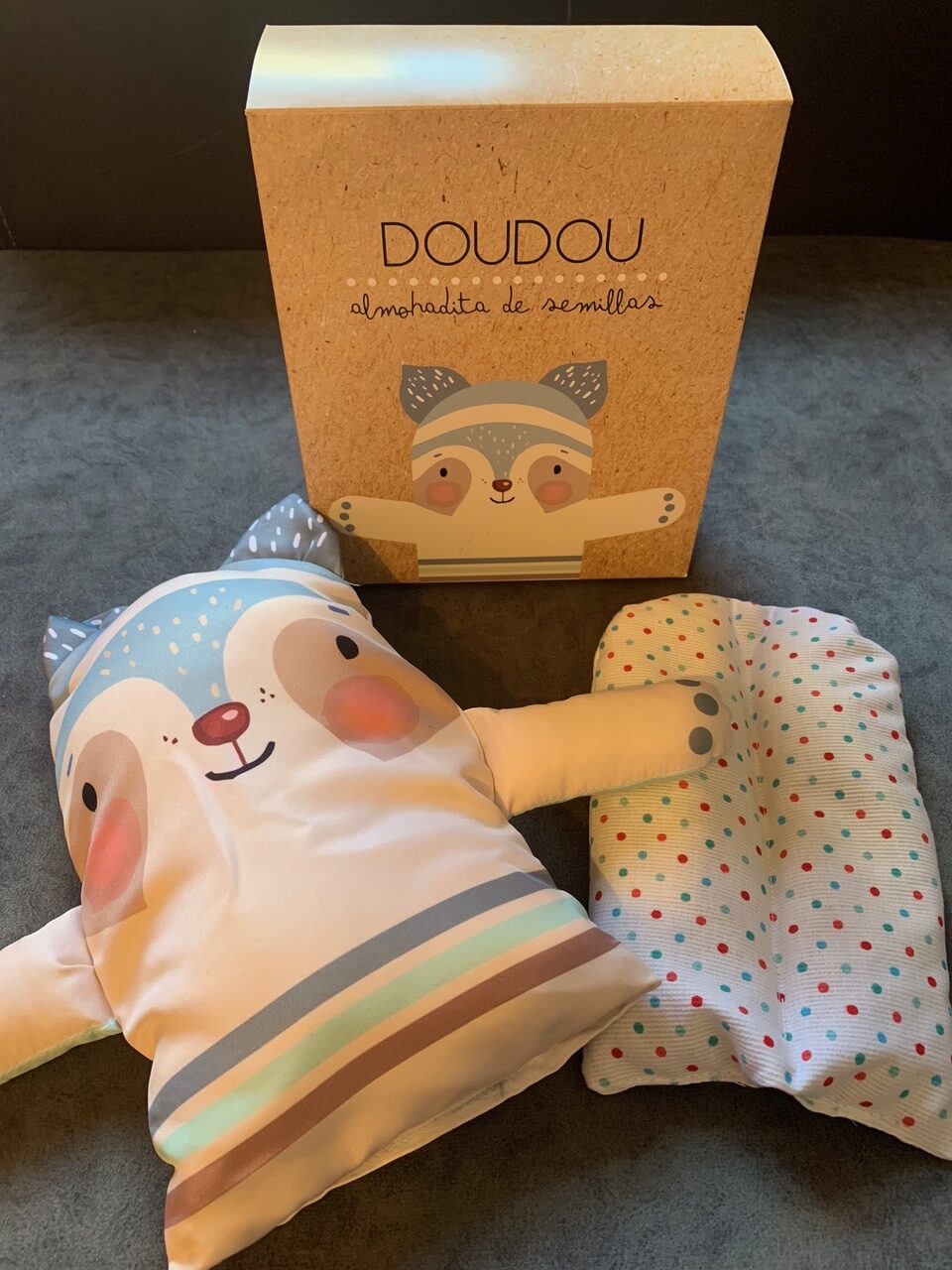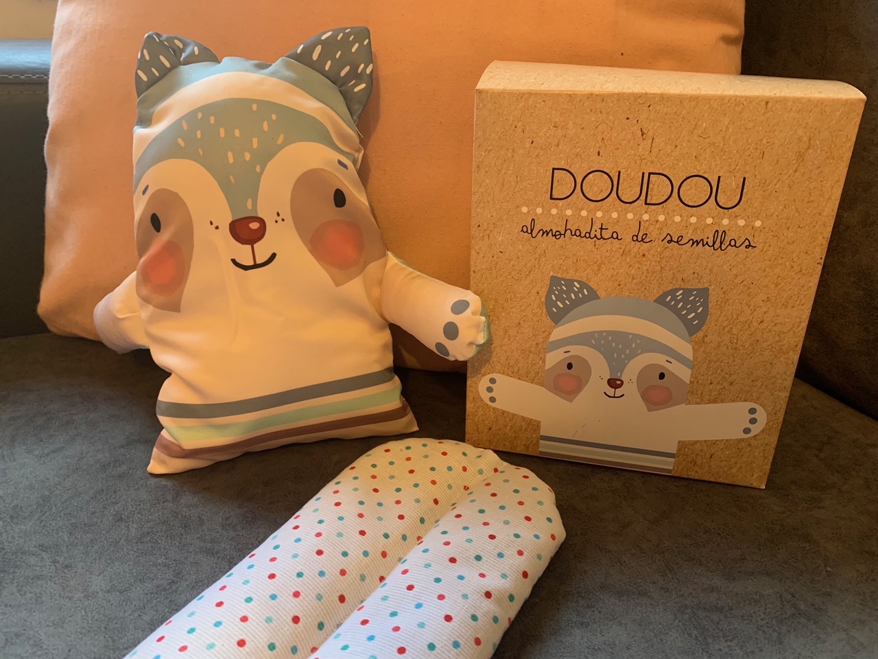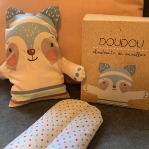 El set incluye: doudou de tela, almohadita de vellón siliconado hipoalergénico y almohadilla de semillas.
