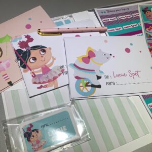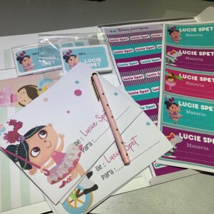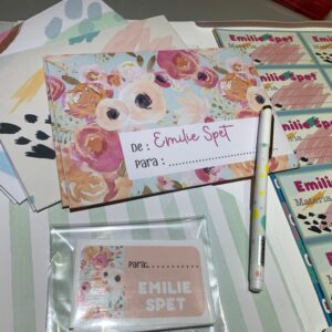 Set que incluye sobres , papeles carta , plancha de stickers y tarjetas de presentación en carpeta de guardado tamaño A4. Se puede optar por la personalización del set con el agregado de stickers para lápices y cuadernos.